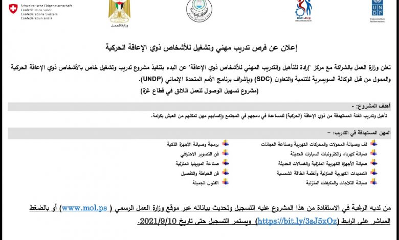 تعلن وزارة العمل بالشراكة مع مركز “إرادة للتأهيل والتدريب المهني للأشخاص ذوي الإعاقة” عن البدء بتنفيذ مشروع تدريب وتشغيل خاص بالأشخاص ذوي الإعاقة الحركية والممول من قبل الوكالة السويسرية للتنمية والتعاون ((SDC وبإشراف برنامج الأمم المتحدة الإنمائي ((UNDP.