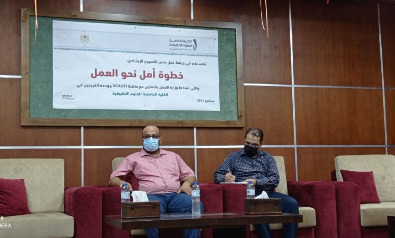 ضمن فعاليات الأسبوع الإرشادي “خطوة أمل نحو العمل”، نفذت وزارة العمل يوم الثلاثاء 14/9/2021 اللقاء الثاني لطلاب الكلية الجامعية للعلوم التطبيقية بمدينة غزة، بمشاركة حاضنة يوكاس التكنولوجية.