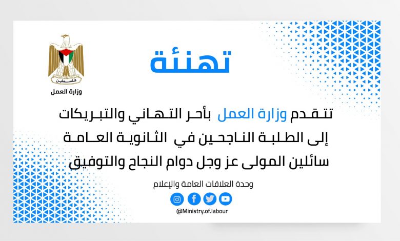 تتقدم وزارة العمل بأحر التهاني والتبريكات إلى الطلبة الناجحين بامتحان الثانوية العامة.