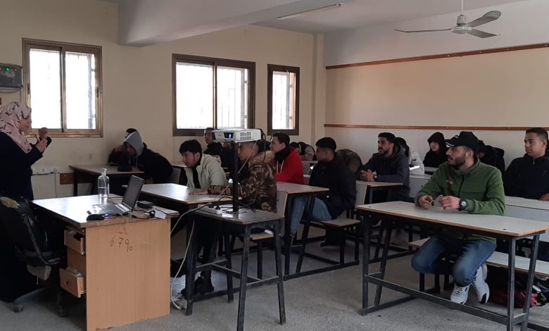 وقدمت اللقاء الأول أ. تهاني السلطي ممثلة عن الإدارة العامة للتفتيش وحماية العمل في مركز تدريب مهني دير البلح، لقسمي الكهرباء العامة والتبريد والتكييف.