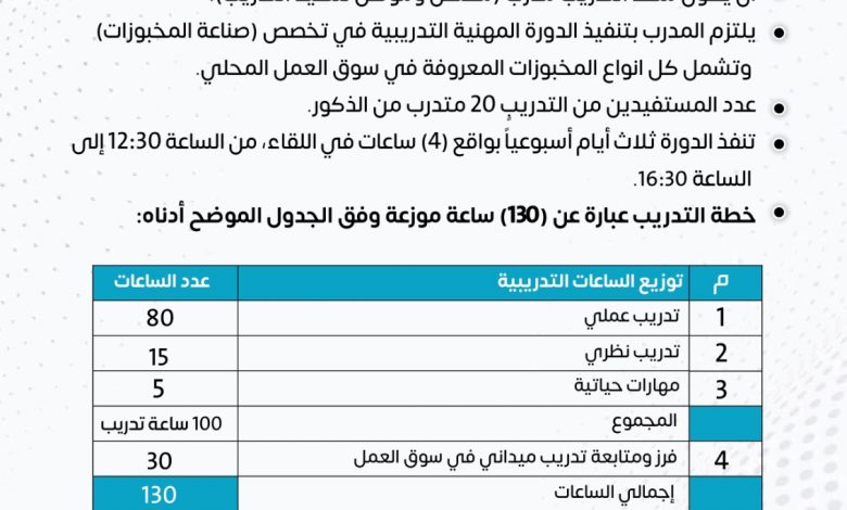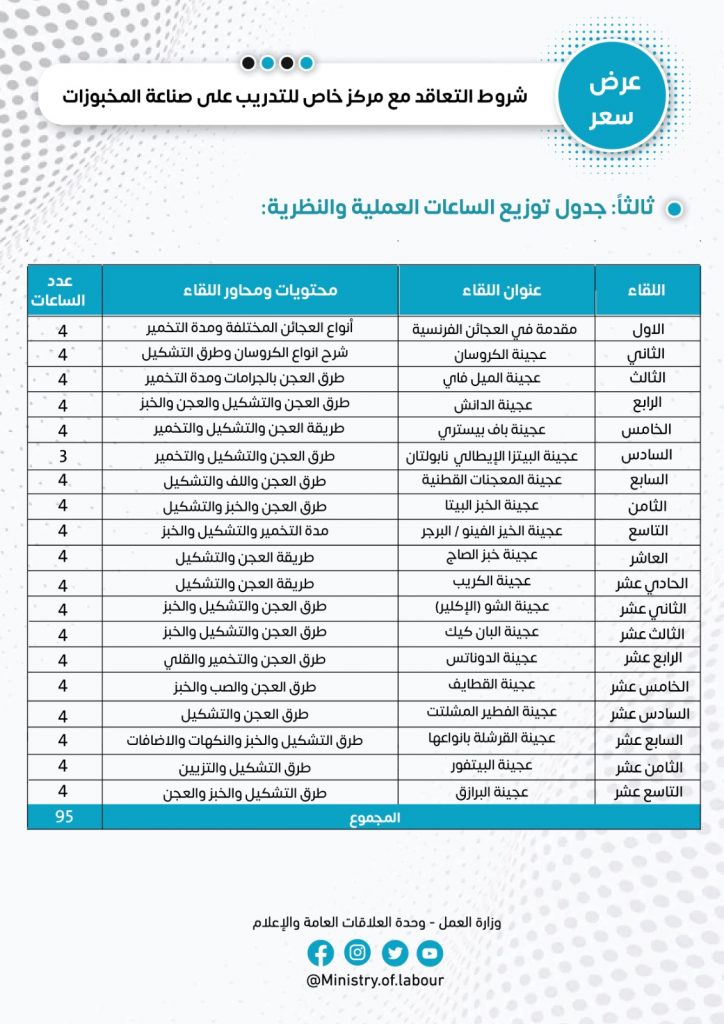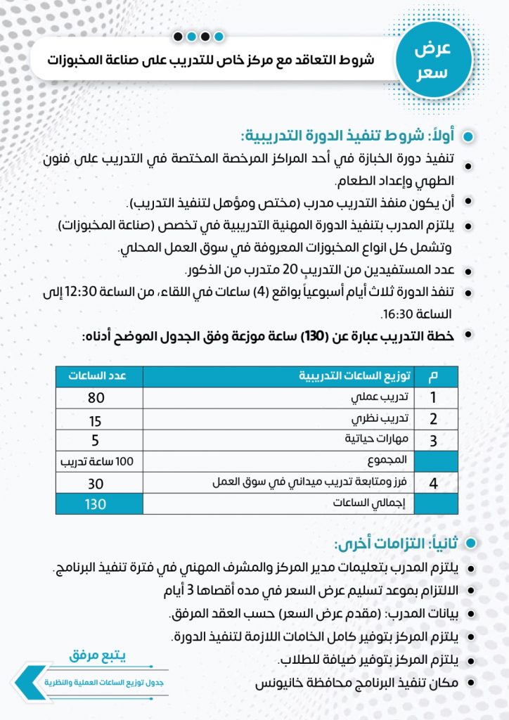 تعلن وزارة العمل عن فتح عروض أسعار لتنفيذ دورة الخبازة في أحد المراكز المهنية المختصة في التدريب على فنون الطهي وإعداد الطعام