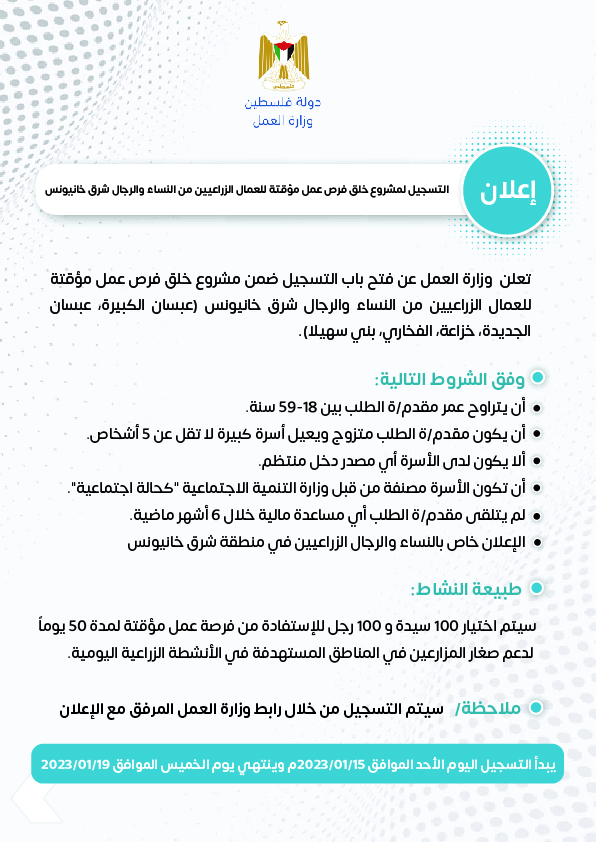 تعلن وزارة العمل عن البدء بالتسجيل لمشروع خلق فرص عمل مؤقتة للعمال الزراعيين من النساء والرجال شرق خانيونس، من خلال الرابط التالي: 👇👇