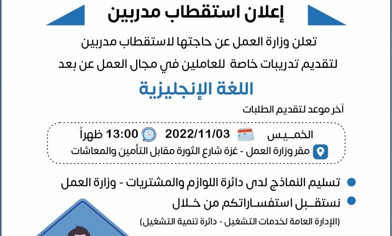 تعلن وزارة العمل عن حاجتها لاستقطاب مدربين لتقديم تدريبات خاصة باللغة الانجليزية للعاملين في مجال العمل عن بعد.