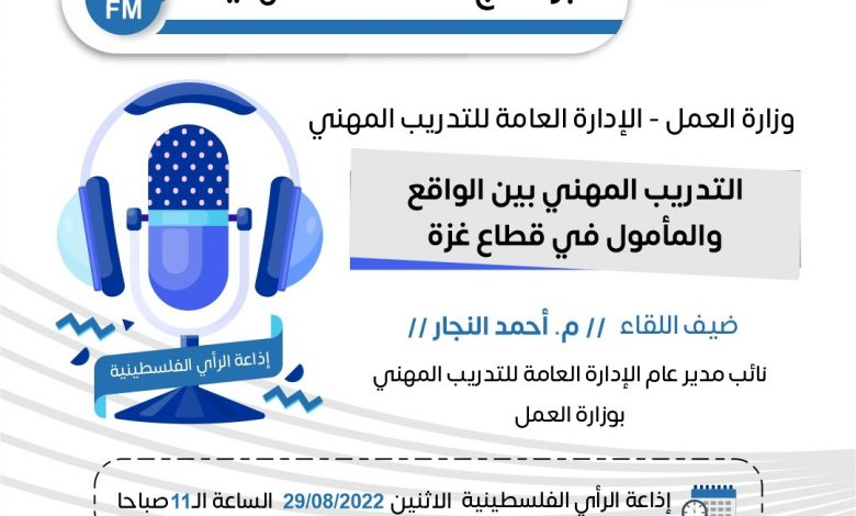 أطلقت وحدة العلاقات العامة والإعلام بوزارة العمل، اليوم الاثنين 29/8/2022، برنامجها الإذاعي الجديد “تخصصات مهنية”، عبر أثير إذاعة الرأي الفلسطينية.
