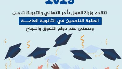 تتقدم وزارة العمل بأحر التهاني والتبريكات إلى الطلبة الناجحين بامتحان الثانوية العامة. متمنين لهم جميعاً مستقبلاً زاهراً مكللاً بالتفوق والنجاح.